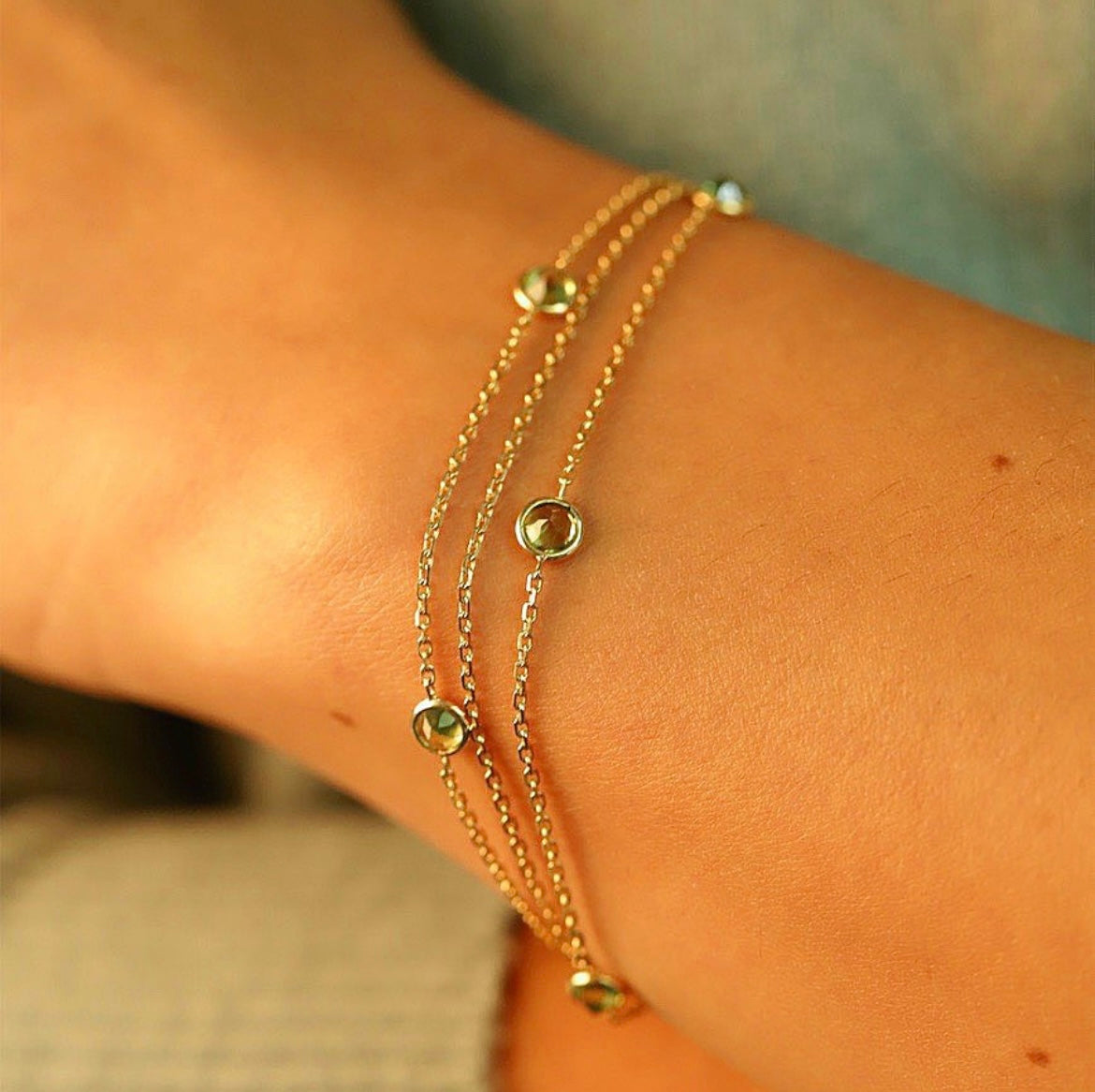 Le bracelet Mathilde est une pièce très équilibrée. Sept pierres sont disposées en quinconce sur deux chaînes de part et d'autre d’une troisième qui apporte la finesse au bracelet. Les pierres sont délicatement entourées d’un fil d’or sur le feuilletis*, ce qui permet de rendre les pierres lumineuses sous toutes leurs facettes.